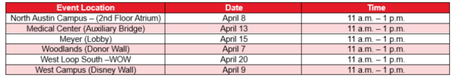 The Well-Being team will distribute small plants and financial resources to all team members at the following locations. If you have any questions, please get in touch with us at wellbeing@texaschildrens.org.