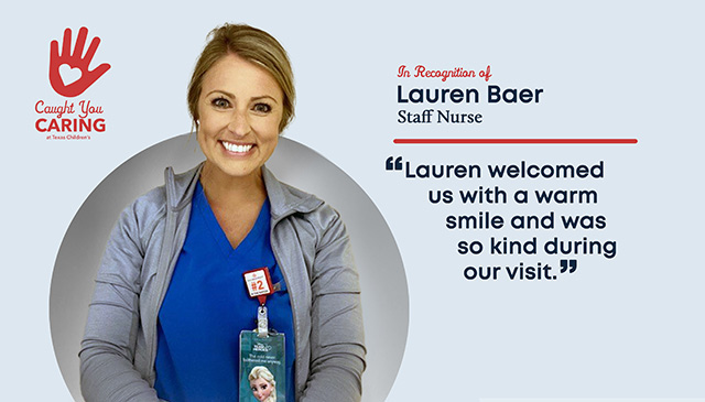 Appreciative parent submitted the following Caught You Caring recognition for Staff Nurse Lauren Baer. “Lauren welcomed us with a warm...